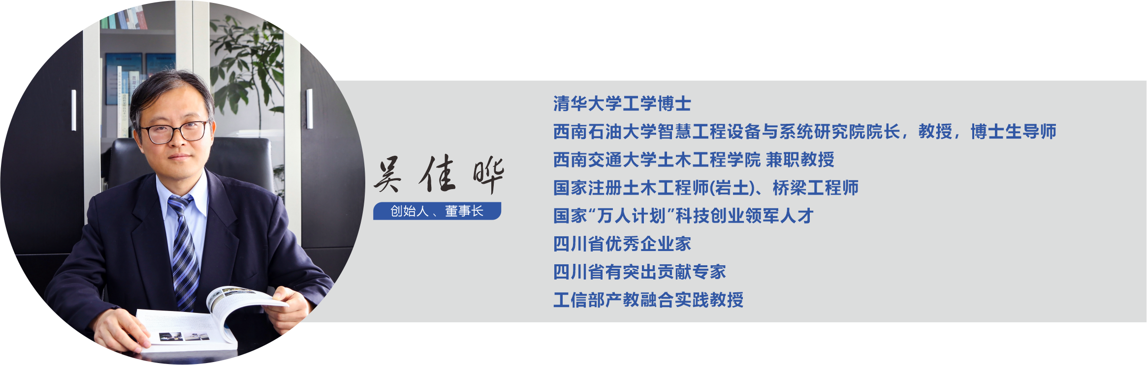 吴佳晔简介吴佳晔,男,博士,1970年生,四川自贡人。1996年毕业于清华大学水利水电工程系岩土工程专业,工学博士;注册岩土工程师、桥梁检测工程师;国家万人计划领军人才、四川省千人计划特聘专家、四川省有突出贡献优秀专家、四川省优秀企业家。现任西南石油大学机电学院教授、博导,西南交通大学兼职教授,四川升拓检测技术股份有限公司董事长。致力于工程检测、健康监测及智慧建养技术研究,主持各级别科研课题多项,作为第一发明人授权专利40余项,编审教材3部,出版专著1部,获得国家、行业等科技荣誉奖励近20项,参编各级标准规程40余项,发表国内外学术论文70余篇。科研成果广泛应用于交通、铁路、建筑、水利等领域,获省部级科学技术奖励十余项。任职于多个学术组织,主要有:中国混凝土与水泥制品协会工程检测分会副理事长,中国市政学会技术专委会委员,全国交通运输职业教育教学指导委员会委员,《中国测试》《市政技术》期刊编委,《工业建筑》期刊理事,《公路交通科技》《铁道建筑》等期刊审稿专家。