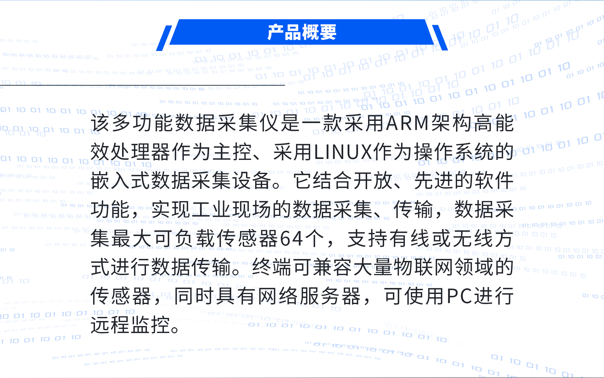 该多功能数据采集仪是一款采用ARM架构高能效处理器作为主控、采用Linux作为操作系统的嵌入式数据采集设备。它结合开放、先进的软件功能,实现工业现场的数据采集、传输,数据采集最大可负载传感器64个,支持有线或无线方式进行数据传输。终端可兼容大量物联网领域的传感器,同时具有网络服务器,可使用PC进行远程监控。