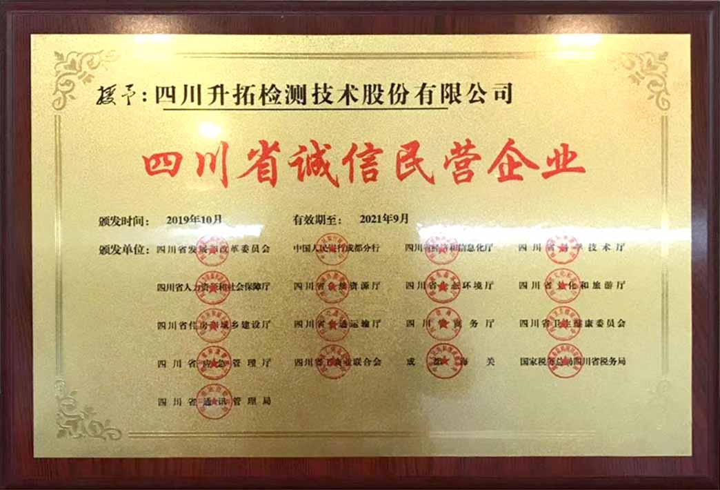 四川省首届民营企业“诚信百千工程”评选四川升拓检测技术股份有限公司评为“四川省诚信民营企业” 诚信是企业重要的无形资产,是企业赖以生存的制胜法宝,也是企业的核心竞争力;努力建设企业诚信,营造一个良好的市场环境,才能铸就企业成功之路。 为贯彻落实党的十九大和省委十一届三次、四次会议精神,健全“褒扬诚信,惩戒失信”机制,营造浓厚的社会诚信氛围,促进我省经济高质量发展,由四川省发改委、经济信息厅、科技