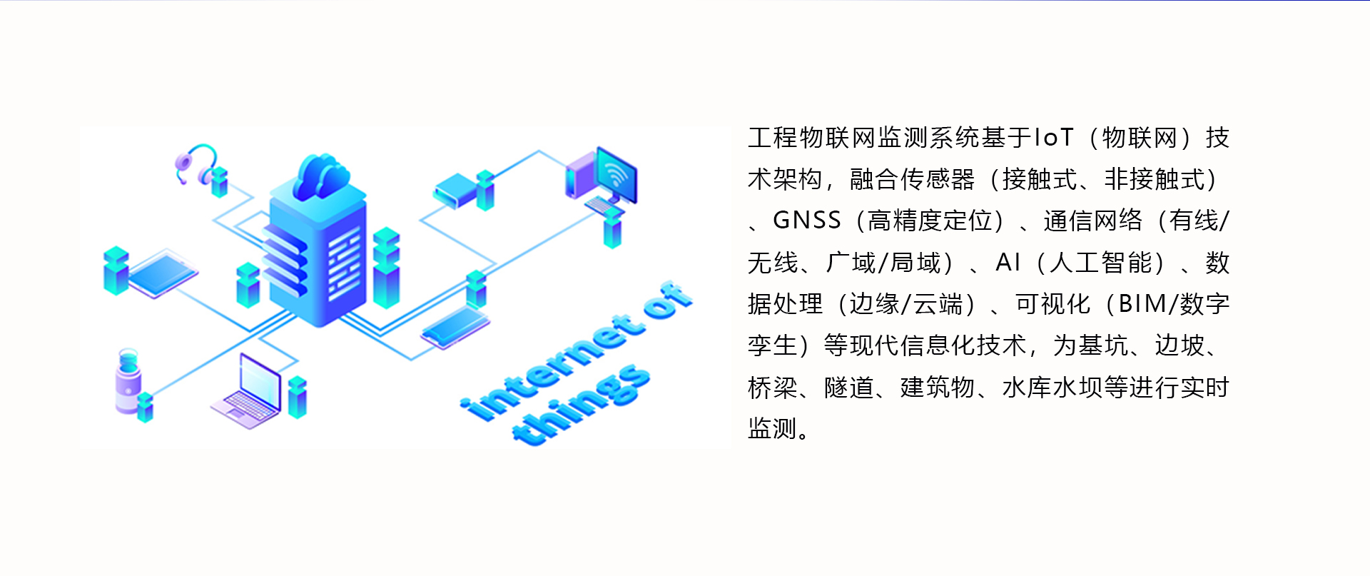 工程物联网监测系统基于IoT(物联网)技术架构,融合传感器(接触式、非接触式)GNSS(高精度定位)、通信网络(有线/无线、广域/局域)、AI(人工智能)、数据处理(边缘/云端)、可视化(BIM/数字孪生)等现代信息化技术,为基坑、边坡桥梁、隧道、建筑物、水库水坝等进行实时监测。